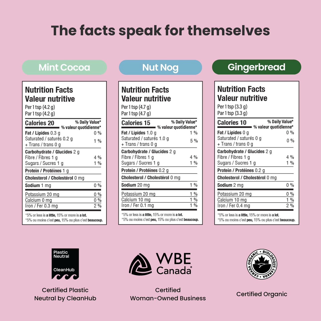 The perfect gift set for anyone on the naughty or nice list. This trio of spiced Gingerbread, creamy Nut Nog and soothing Mint Cocoa will be the perfect stocking stuffer or holiday treat for yourself. These holiday classic lattes have a functional superfood twist to enjoy a feel good treat.