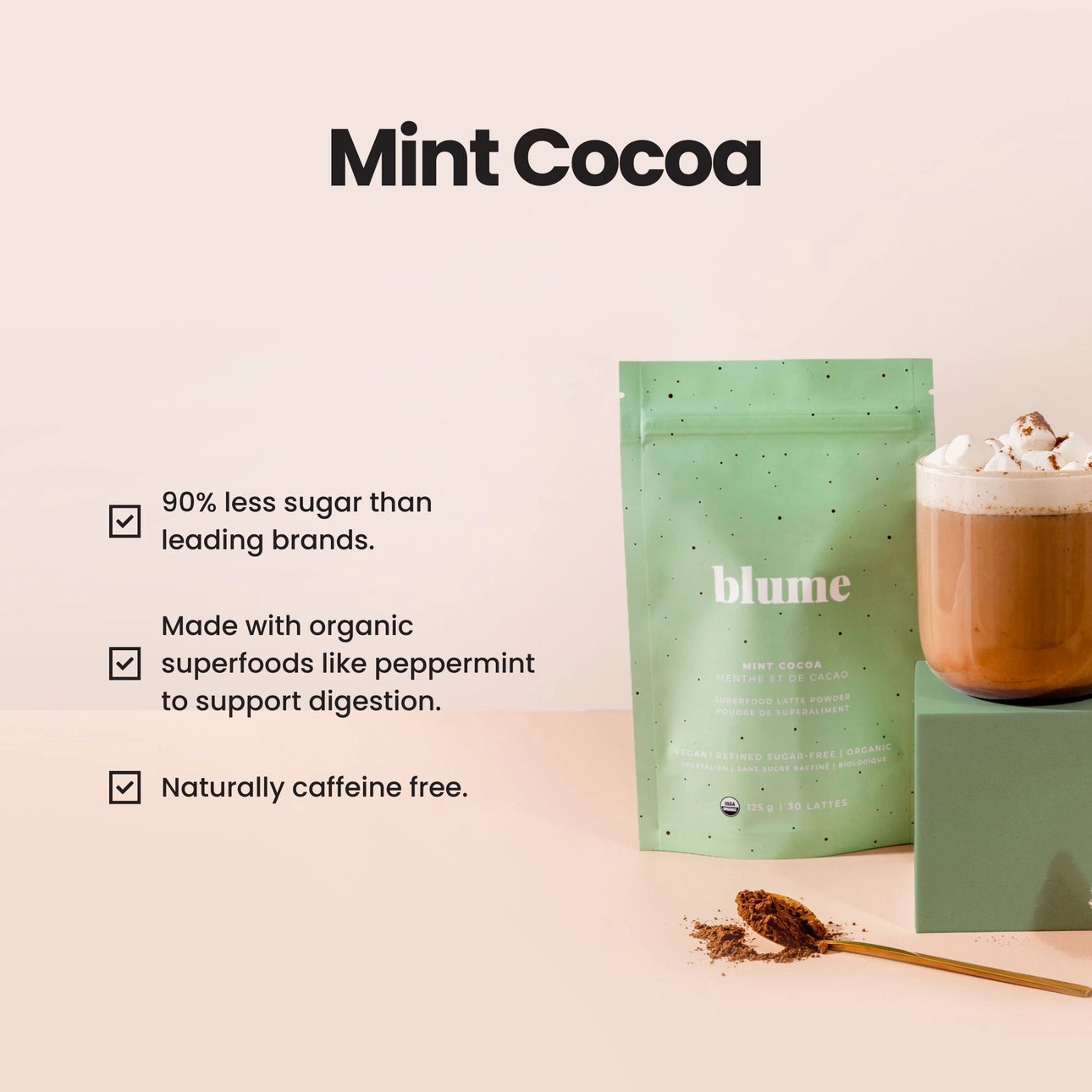 Mint Cocoa It’s giving “After Eight” with rich dark chocolate and just a hint of peppermint to support digestion. Make with your fave milk, sweetener and top with whipped cream for the perfect winter treat. (45g)