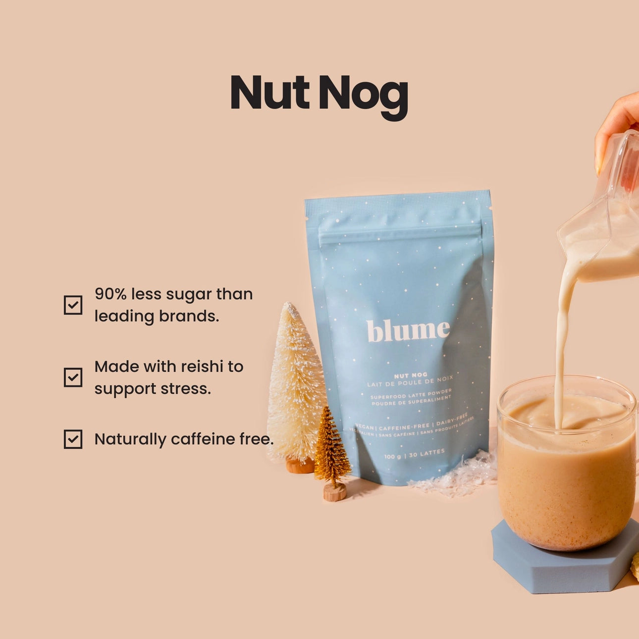 Nut Nog Our nut nog is rich and creamy without being heavy. It has the classic nutmeg and rum notes you crave in a classic eggnog but without the egg. It’s a warming vanilla-based latte that is a real crowd-pleaser. (45g)